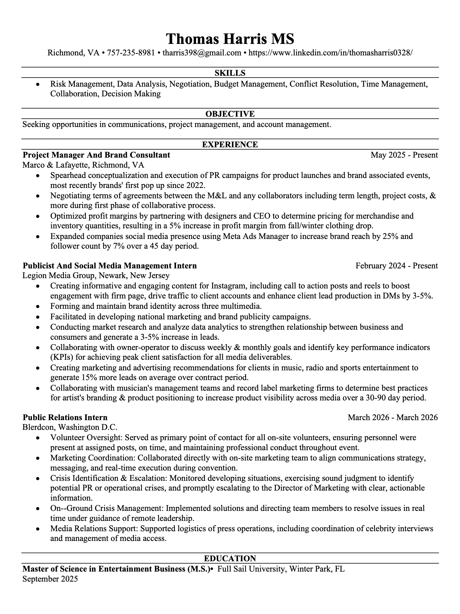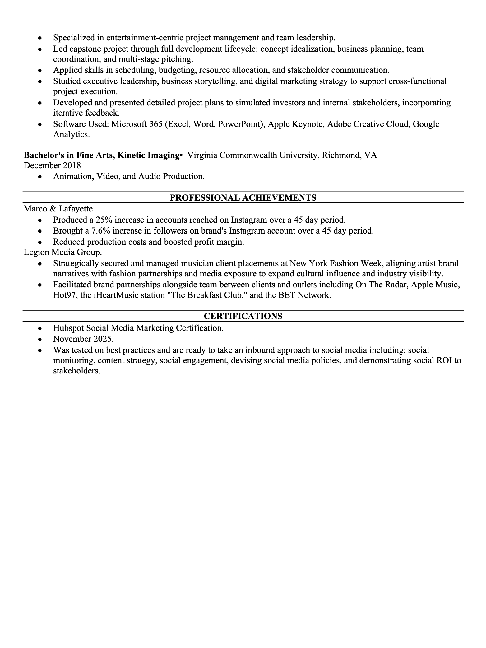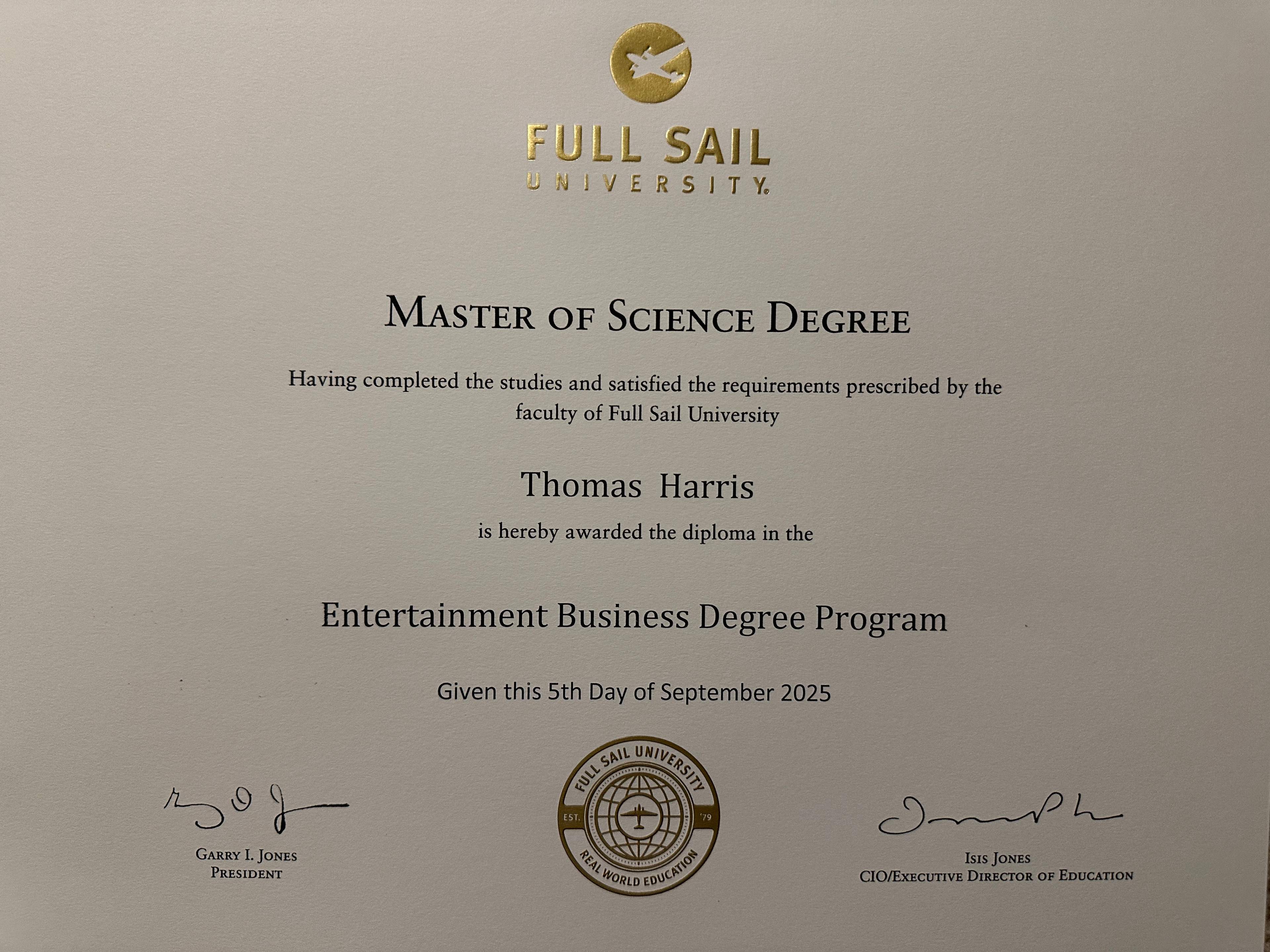 My purusuit of a career in the music industry brought me to obtain my masters of entertainment business in the fall of 2025 from Full Sail University while in my second year of my internship with Legion Media Group. I will be continuing my education in the fall of 2027 studying law to begin my career as an entertainment lawyer.